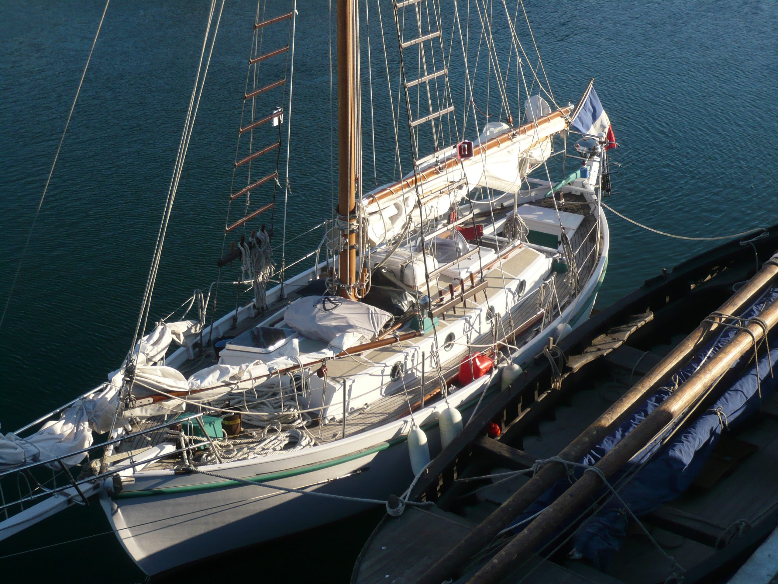 Nous sommes les 3 eme propriétaires. Le premier était Roland Meausoone jusqu’ en 1987. Nous avons racheté le bateau à Monsieur Kioc’han de Kersabiec, et à son épouse. Ces derniers propriétaires ont fait de gros travaux d’aménagement intérieur , menuiserie et sellerie , dans le but d’entreprendre une navigation en Mediterranée qui a duré plusieurs années.