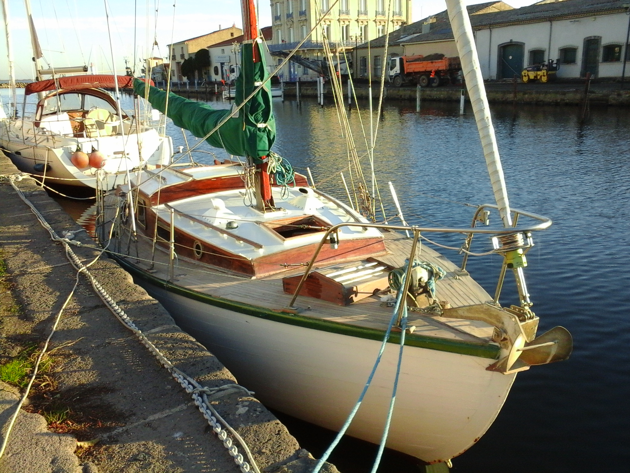 BOIS. Charpente traditionnelle. Quille/étrave/étambot: Chêne. Varangues: chêne. Membrures: acacia ployé. Bordés rivetés cuivre: acajou/iroko 27mm.Pont et superstructures / à propos :