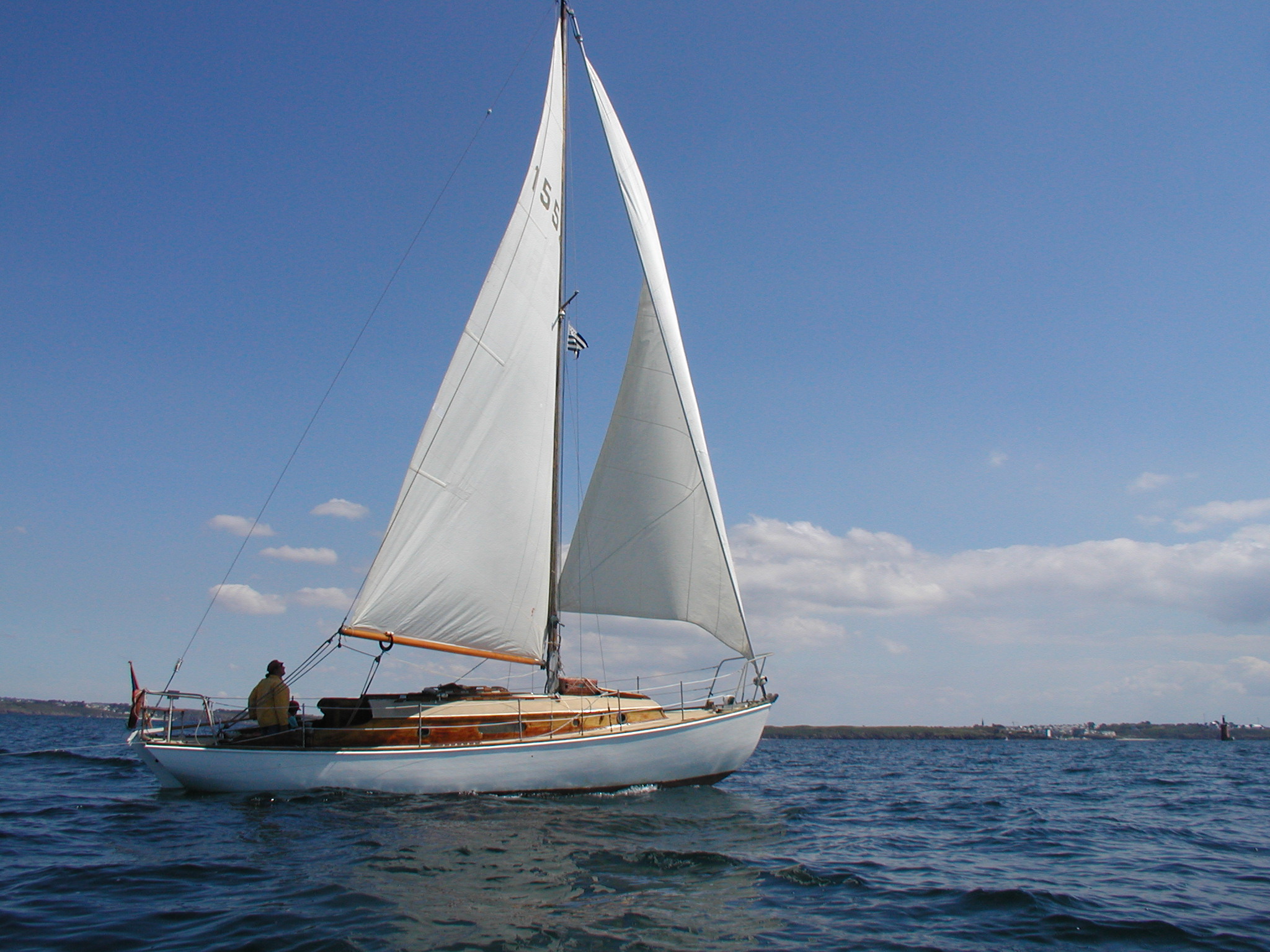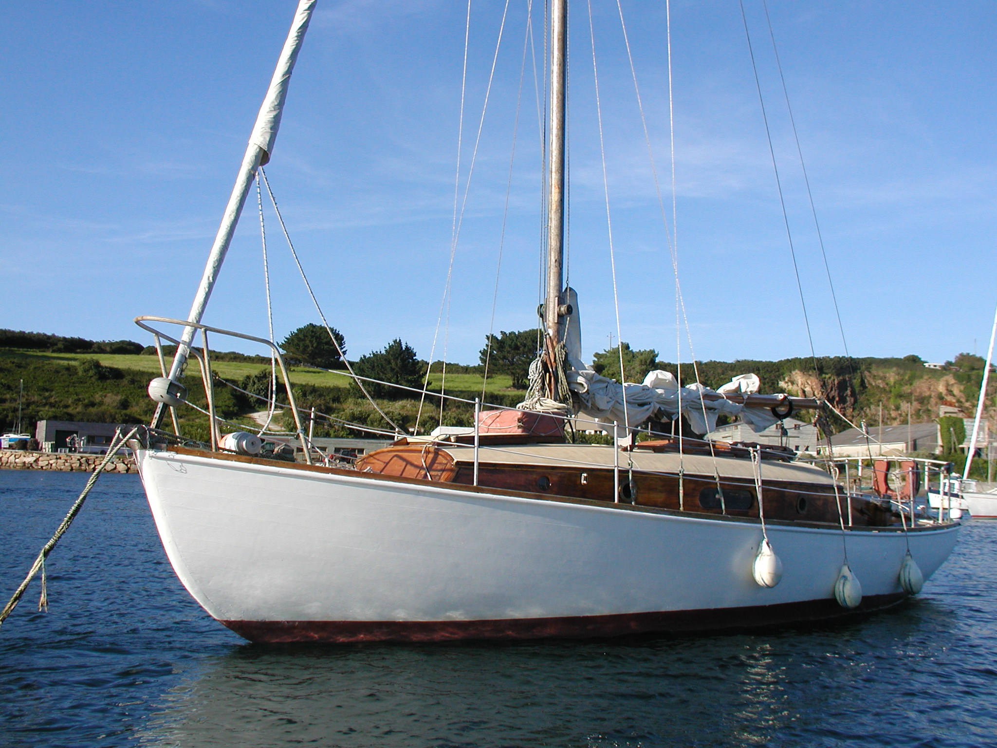 Construction classique. Bordés acajou sur membrures acacia. Dériveur lesté (800kg) Tableau arrière Gouvernail extérieurPont et superstructures / à propos :