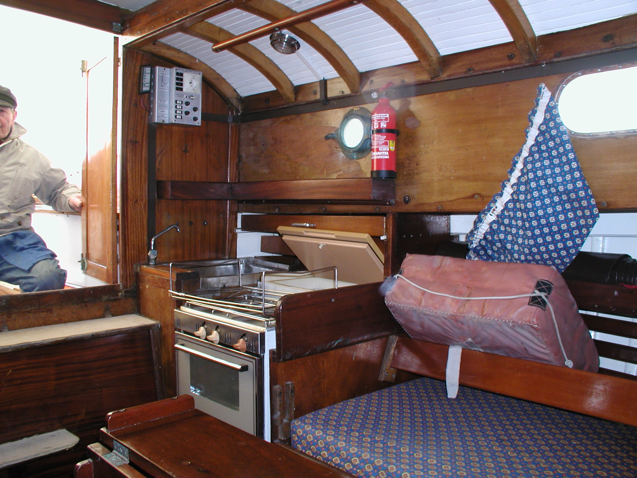 Poste avant : deux banquette formant couchette et le puits à chaine un compartiment WC avec en face une penderie Carré avec deux couchettes et table pliante en acajou sur puis de dérive babord arrière, espace cuisine Tribord arrière table à carteEmménagements / état actuel :