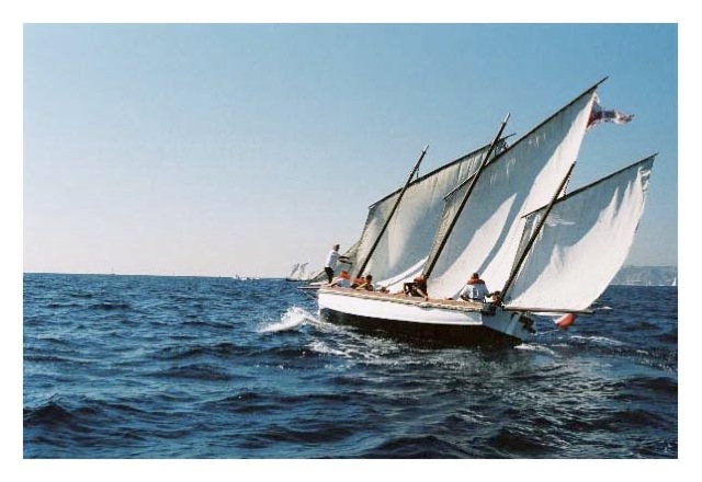 3 mâts au tiers pour 4 voiles: GV, misaine, tapecul et foc établies respectivement sur une queue-de-malet et un bout-dehors ( cf. la longueur hors-tout)Voilure / à propos :