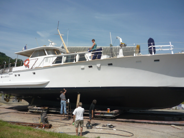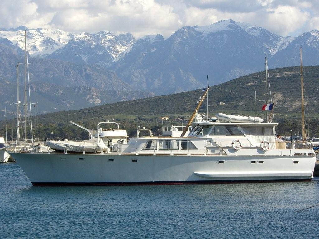 De l'AV à l'AR : Puits à chaine avec bac récupération. Poste équipage 1 couchette. Compartiment cuisine, salle à manger équipage. Compresseurs réfrigérateur et chambre froide sous plancher. A Bd, cabine 2 couchettes, placards. A Td, Cabinet toilette douche lavabo WC. Escalier amovible accès Deck-Salon - entrée machines. Compartiment machines sous plancher Deck-Salon. Deck-Salon salle à manger propriétaires. Descente vers aménagements AR. A Bd, cabine 2 couchettes penderie. A Td cabinet toilette douche lavabo WC. Grande cabine AR lit double sur toute la lageur du yacht. A Td, petit local indépendant WC. A Bd, salle de bain baignoire lavabo. Coqueron extrème AR accessible par panneau sur le pont AR.Emménagements / état actuel :