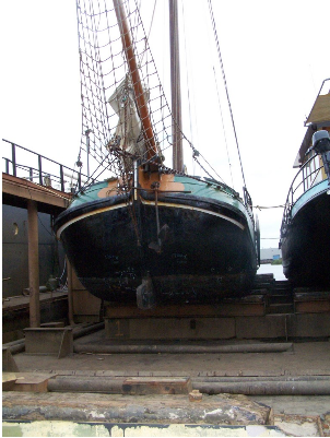 Coque en acier, structure longue et étroite, formes très arrondies à l'avant et à l'arrière. Fond plat.