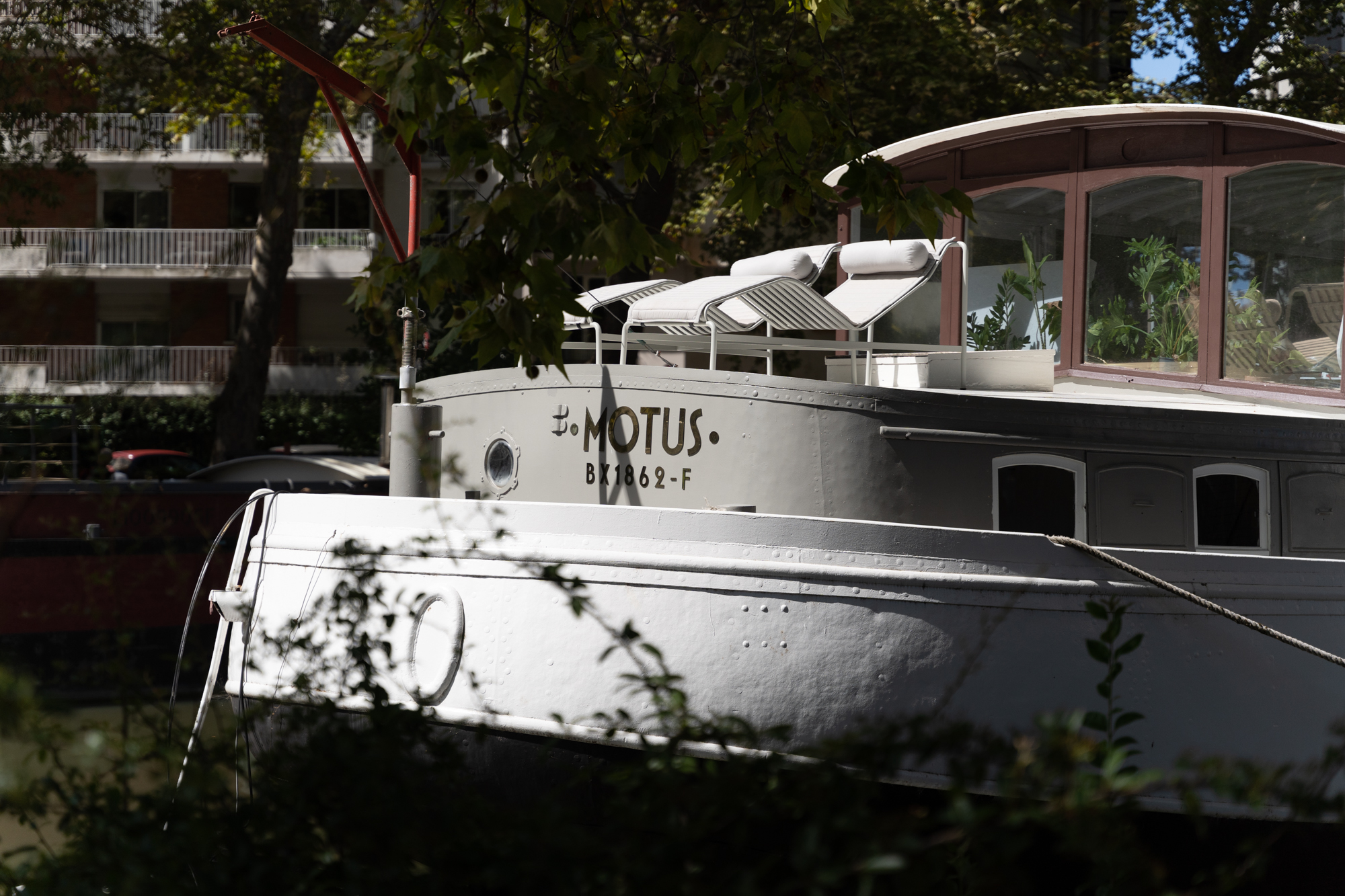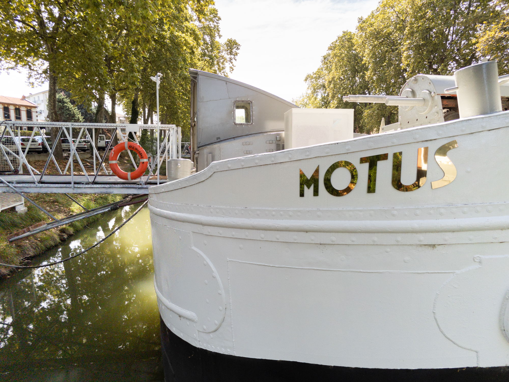 Péniche de type Freycinet construite en 1930 aux Chantiers Navals de la Meuse à Givet. Coque type "cul de poule » en acier riveté. La société « Ateliers et chantiers navals de la Meuse » est créée en 1927, sur la commune de Rancennes, au lieu-dit « La Meuse » en face de Charlemont. Ce chantier naval fut le plus moderne pour la construction de péniches en fer et des tout premiers automoteurs. Ces automoteurs en fer, très compétitifs pour l’époque, étaient appelés « de Givet » et « au cul de poule » à cause de la forme arrière caractéristique. Les tôles venaient des usines de Vireux et le moteur était de marque Kromhout. Mauvaises affaires ou craintes de la guerre menaçante, la dissolution de la société fût prononcée en 1938. De ce chantier sont sorties uniquement une vingtaine de péniches, dont MOTUS ex ARTISAN, qui fut en 1961 le premier automoteur en fer arrivé sur le canal du midi.Pont et superstructures / à propos :