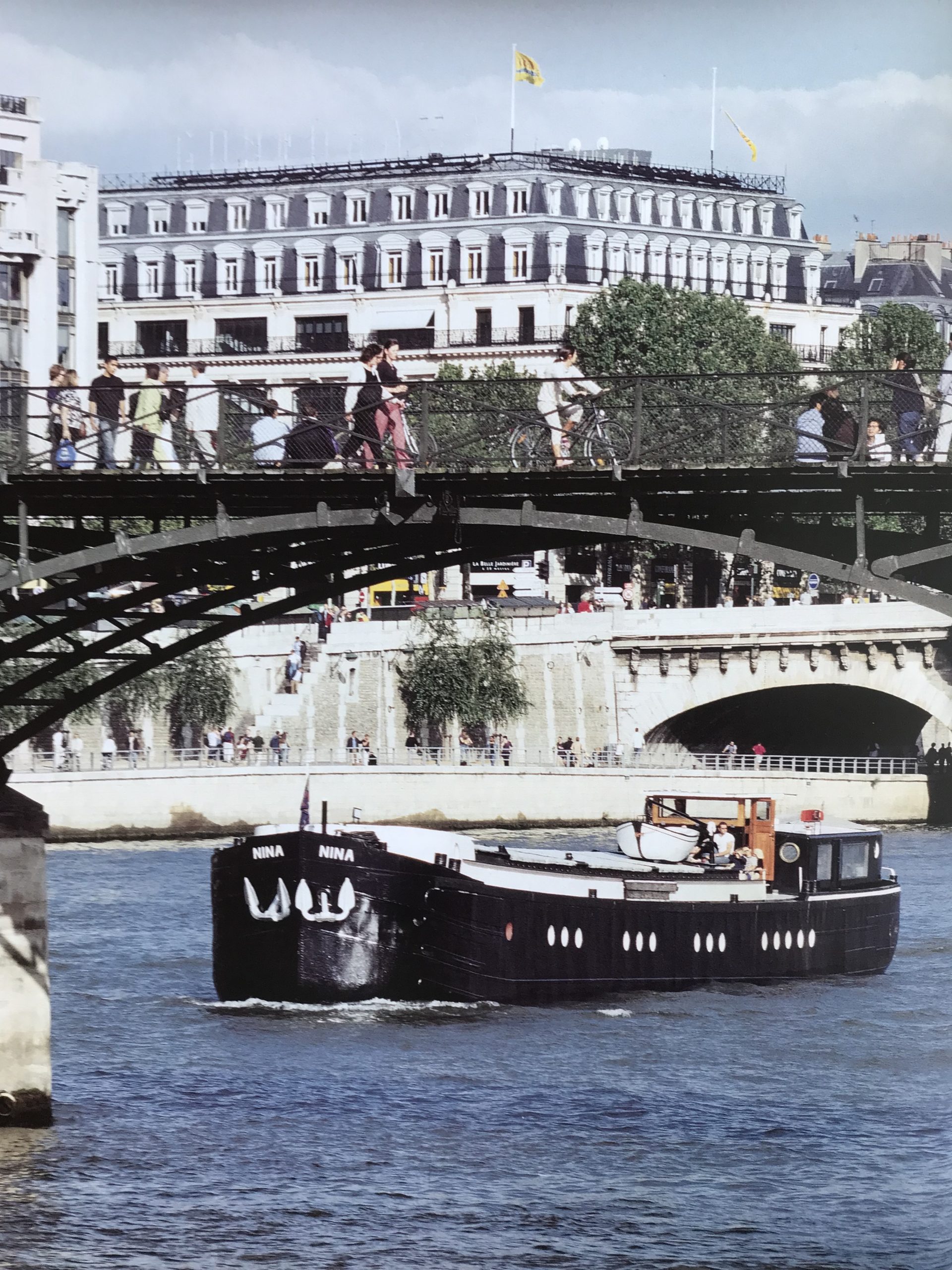 Hendrik Meirlaen et Emerence Vandenbusshe, les propriétaires précédents, l’ont commandé au chantier Mory (Belgique) en 1958. Ils ont tenu à dessiner eux-mêmes le logement du marinier car ils le souhaitaient plus spacieux que la norme de l’époque. Ils l’ont baptisé « Nina » du nom de leur fille unique. Le bateau a conservé sa devise.Hendrik et Emerence convoyaient essentiellement des bobines de tôles métalliques pour la construction automobile, entre la Belgique et la France. Exceptionnellement son dernier voyage fut une cargaison de pois secs en vrac. Il traversa alors Paris direction Gand au mois de juin 1990.Il a été réhabilité en bateau logement ce même été et stationne depuis à Paris. Il navigue toujours. Le Nina a été publié dans « Paris péniche » aux éditions Minerva 2003.