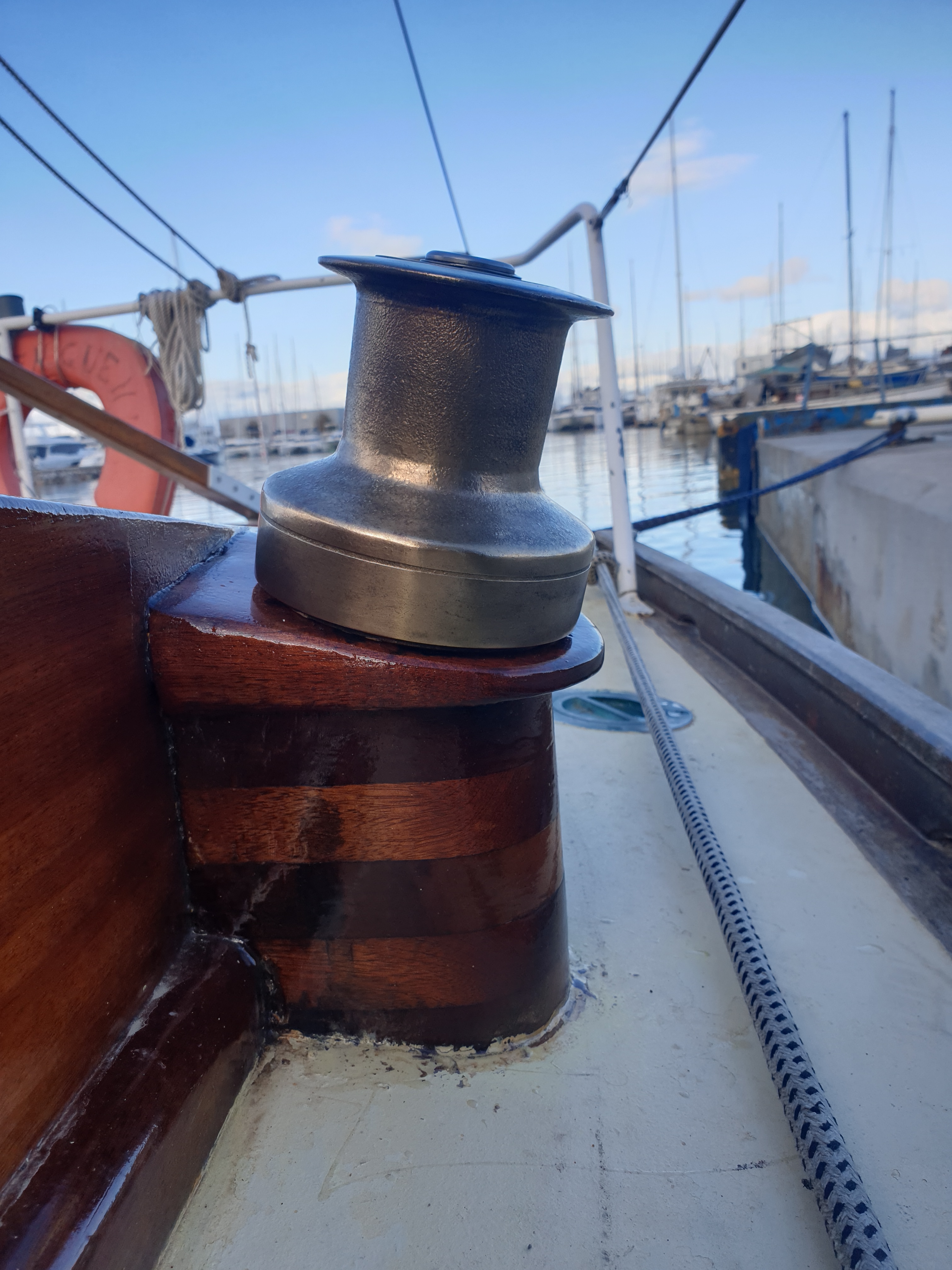 Mât refais en 2018 par scarf en partie basse nvx des jumelles et vernis type COELAN en totalité . Vernis type COELAN pour le cockpit, iloires et autres parties apparentes en bois massif.