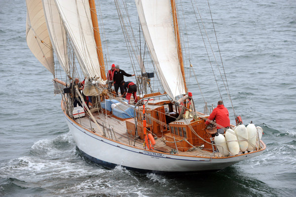 MANOEUVRE A L’ANCIENNE AVEC UN PALAN POUR LA DRISSE ET UN SECOND POUR LA DRISSE D’APIQUAGE. LES EQUIPIERS préposés POUR CHACUNE DES DRISSES DOIVENT HISSER EN CADENCE. DES GESTES QUE L’ON RETROUVE SUR LES LOUGRES ET AUTRES THONIERS.