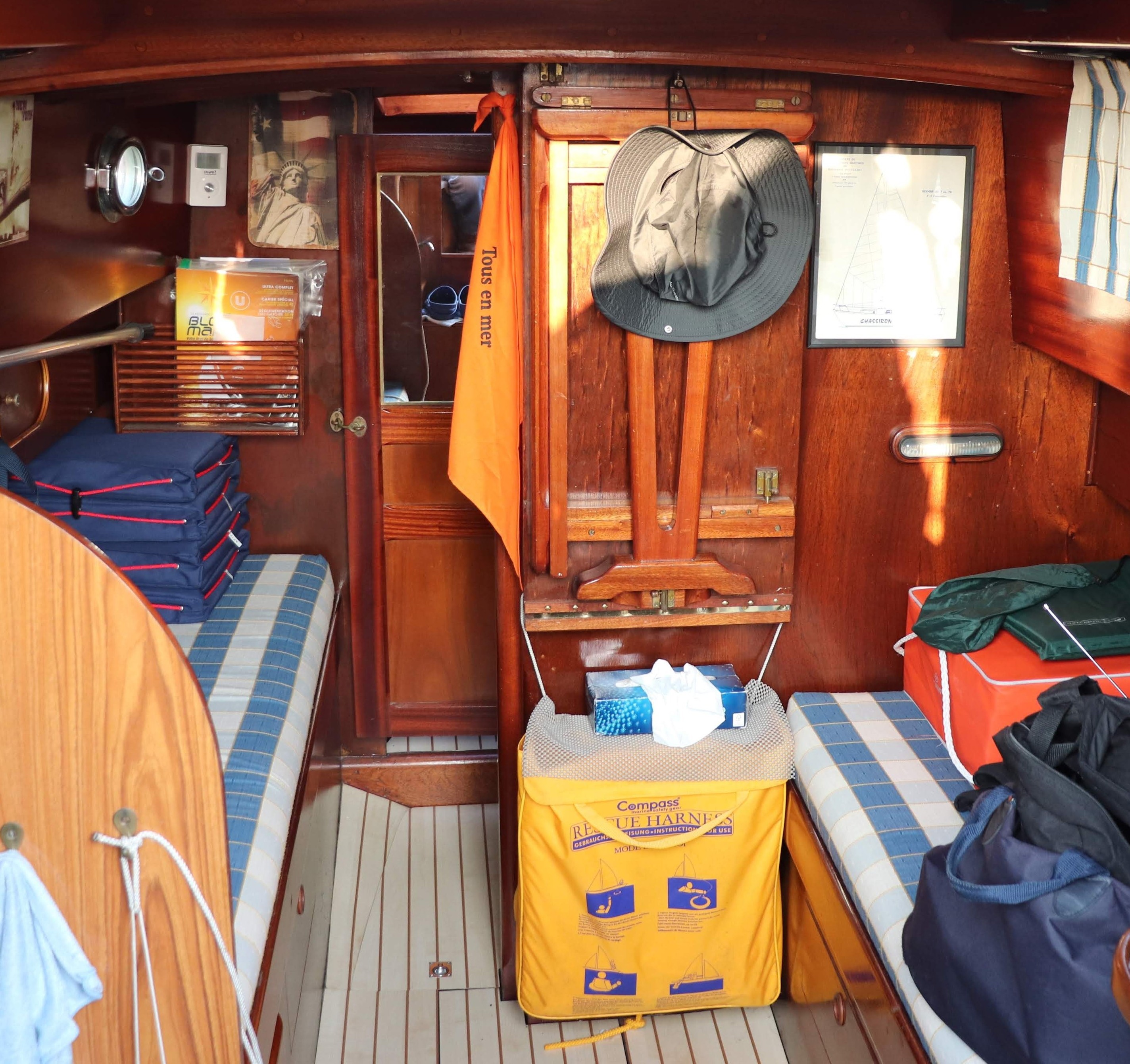 Poste avant, couchette pour deux personnes , coffres sous couchette. Sur tribord, penderie - WC marin - table repliable - une couchette - table à carte - instrumentation et tableau électrique - équipets sur toute la longueur – coffres sous couchette. Sur bâbord – une couchette – coin cuisine avec réchaud à alcool - case réfrigérée avec groupe froid – évier avec eau sous pression – équipets sur toute la longueur – coffres sous couchette. ( Aménagement spécifique dans le carré - 2 couchettes et table repliable ). Bon état – Entretien régulier des vernis – Planchers refait en 2004 - WC marin et vannes 2023.Emménagements / état actuel :